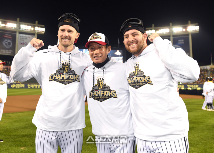 LG 톨허스트, 염경엽 감독, 오스틴(왼쪽쿠너)이 1일 서울 잠실구장에서 열린 ‘한국시리즈 통합우승 IN 잠실’ 행사에서 포즈를 취하고 있다.