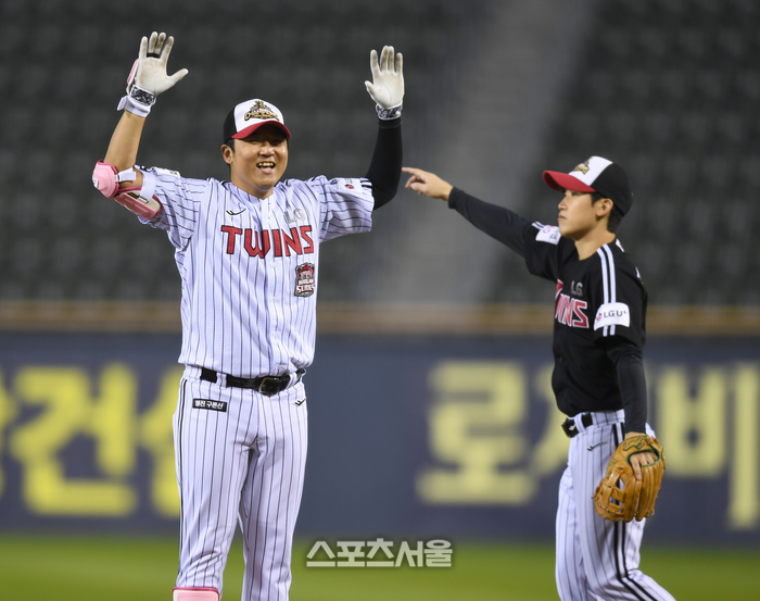 LG 투수 송승기가 1일 서울 잠실구장에서 열린 ‘한국시리즈 통합우승 IN 잠실’ 행사에서 펼쳐진 깜짝 이벤트 경기에서 안타를 친 후 세리머니를 하고 있다.
