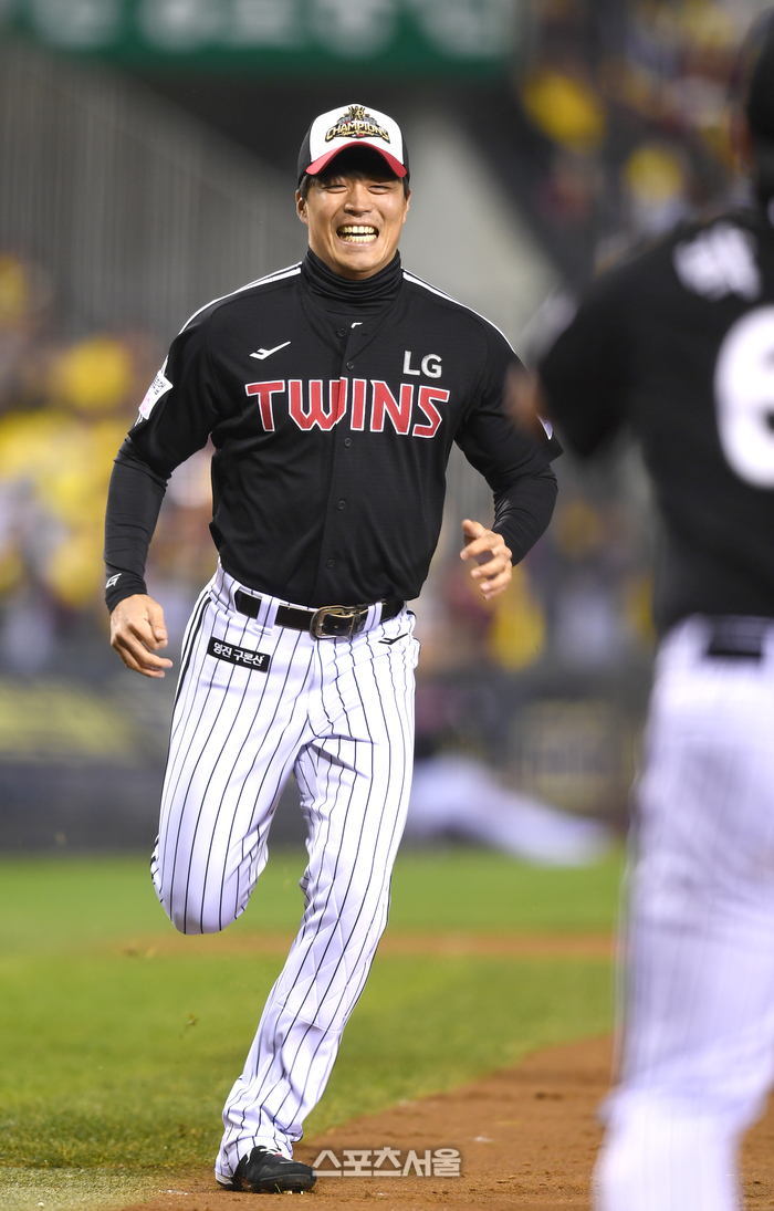 LG 천성호가 1일 서울 잠실구장에서 열린 ‘한국시리즈 통합우승 IN 잠실’ 행사에서 펼쳐진 깜짝 이벤트 경기에서 그라운드 홈런을 치고 있다.