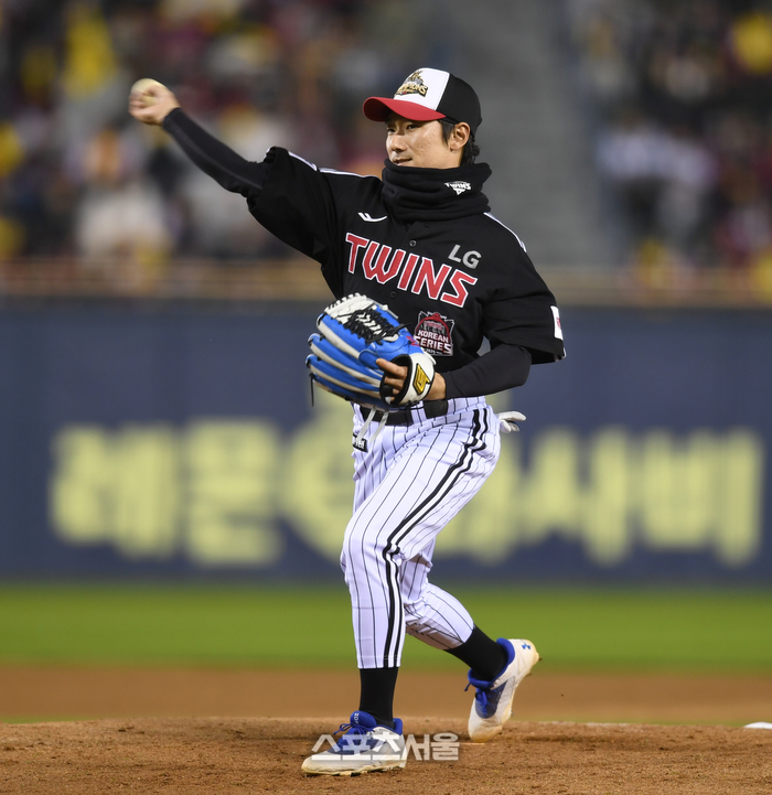LG 투수 신민재가 1일 서울 잠실구장에서 열린 ‘한국시리즈 통합우승 IN 잠실’ 행사에서 펼쳐진 깜짝 이벤트 경기에서 투구를 하고 있다.