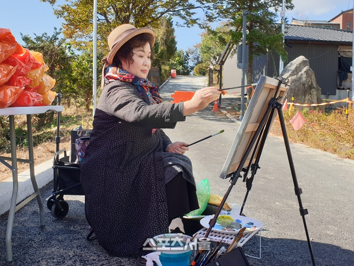 바람이 차갑게 불고, 건조한 날씨로 아크릴 물감이 빨리 말라 칠을 하는 동안 애를 먹기도 하지만 김작가의 표정은 밝기만 하다.