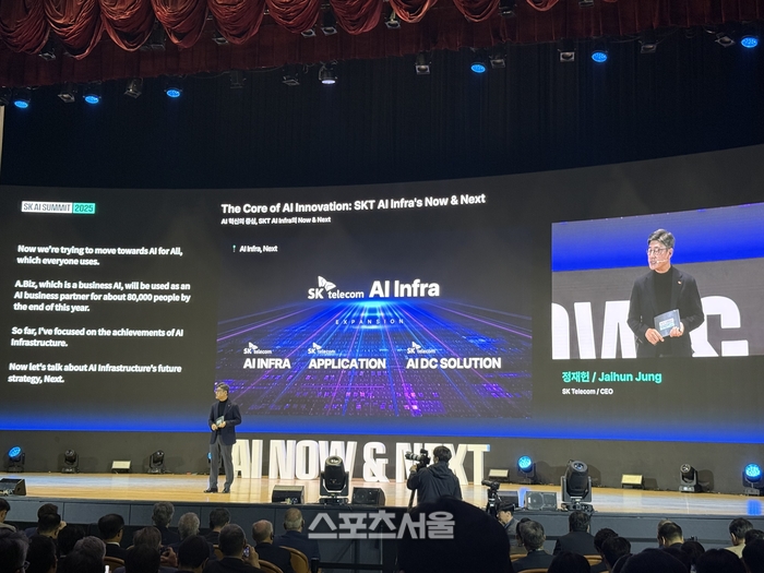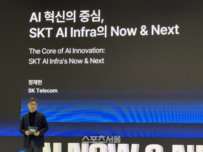 SKT 정재헌 CEO는 3일 서울 강남구 코엑스 오디토리움에서 열린 ‘SK AI 서밋 2025(SK AI SUMMIT 2025)’에서 ‘SKT AI 인프라의 NOW&NEXT’를 주제로 한 키노트 연설을 통해 AI 시장변화 동향과 SKT 성과 및 향후 전략에 대해 소개했다.