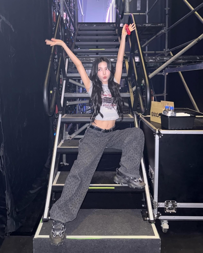 솔라는 무대 뒤 철골 계단에 앉아 짧은 크롭 티셔츠와 독특한 패턴의 팬츠를 입고 양팔을 번쩍 들어 올린 포즈를 취했다. 군살 없는 허리 라인과 강렬한 표정으로 카리스마를 발산했다. 이 외에도, ‘Solaris’ 문구가 새겨진 오프숄더 크롭티로 허리 라인을 강조하며 힙한 분위기를 연출하기도 했다.