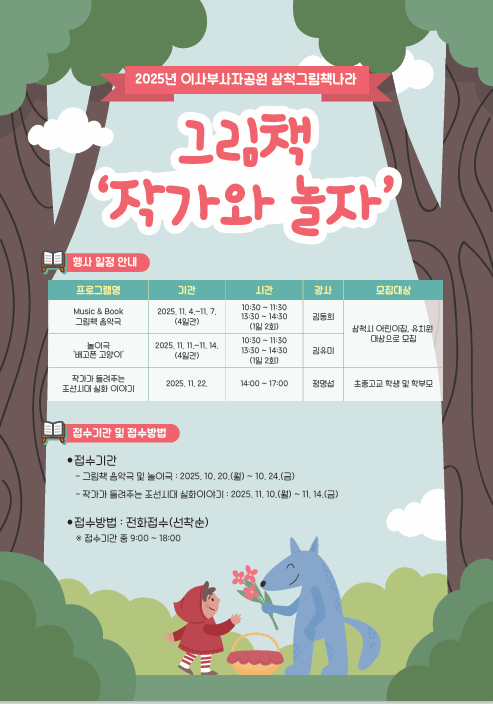 [스포츠서울ㅣ김기원기자]삼척시가 이사부사자공원 ‘그림책나라’에서 11월 4일부터 22일까지 그림책 작가와 전문 강사를 초빙해 ‘그림책 작가와 놀자’ 프로그램을 운영한다.