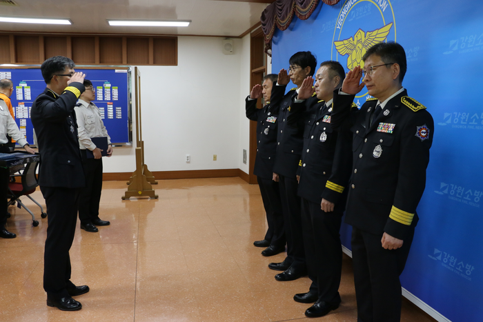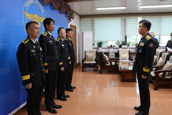 영월소방서는 이날 서장 주재로 열린 임용식에서 승진자들에게 임용장을 수여하고 그간의 노고를 격려했다.