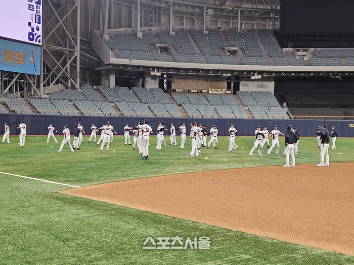 선수들이 많아지자, 확실히 훈련장 분위기가 살아났다. 처음 선수들은 가볍게 몸을 풀었다. 표정과 목소리에는 생기가 넘쳤다. 몸을 풀면서 지르는 선수들의 함성이 고척돔에 울려 퍼졌다.