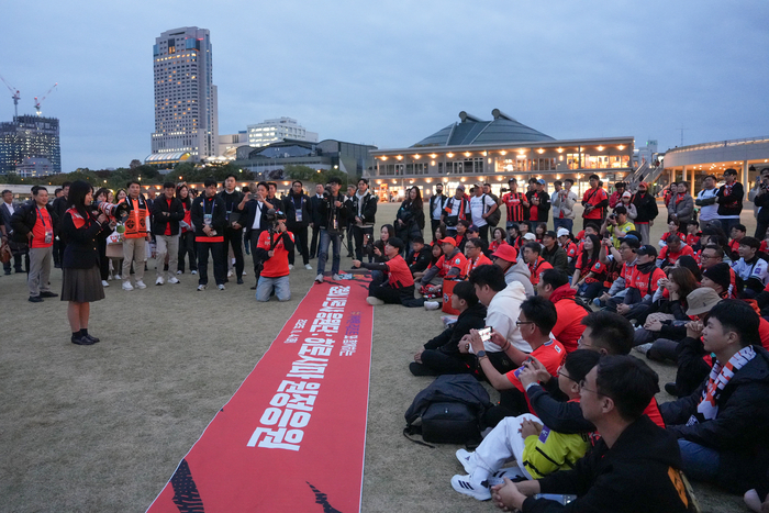 이날 현장에서는 팬 선발 경쟁률 5.56대 1(신청자 556명, 선정자 100명)을 뚫고 일본 원정길에 오른 강원 FC 팬들이 히로시마 현지 청소년과 교민들과 함께 뜨거운 응원전을 펼치며 열기를 더했다.