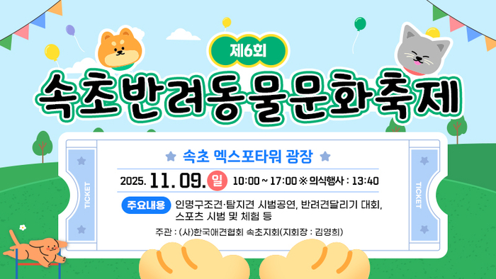 9일(일) 오전 10시에는 엑스포타워 광장에서 ‘제6회 속초반려동물 문화축제’가 열린다.