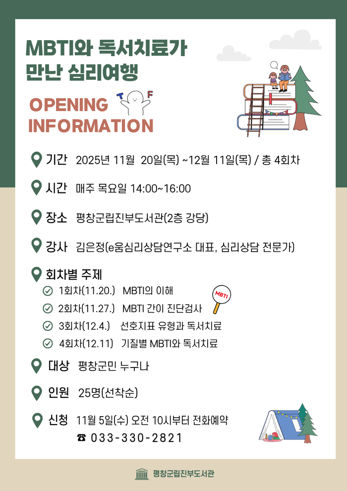 [스포츠서울ㅣ김기원기자]평창군립진부도서관은 오는 11월 20일부터 12월 11일까지 4회에 걸쳐 군민을 대상으로 「MBTI와 독서치료가 만난 심리여행」 강연을 운영한다.