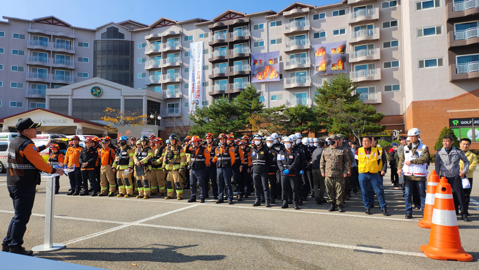 이번 긴급구조종합훈련은 건물 내 폭발화재와 산림화재로의 연소확대 등 대형 재난 발생을 가정해 진행되었으며, 리조트 내 자위소방대 활동, 긴급구조지휘대 및 현장응급의료소 설치‧운영(다수사상자 대응), 긴급구조통제단의 효율적인 운영 및 유관기관과의 유기적인 공조체계 확립에 중점을 두고 시행됐다.