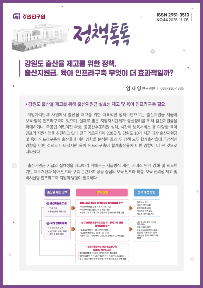 [스포츠서울ㅣ김기원기자]강원연구원(원장 배상근)은 “강원도 출산율 제고를 위한 정책, 출산지원금, 육아 인프라구축 무엇이 더 효과적일까?”라는 제목으로 2025년 제44호 정책톡톡을 발간했다.