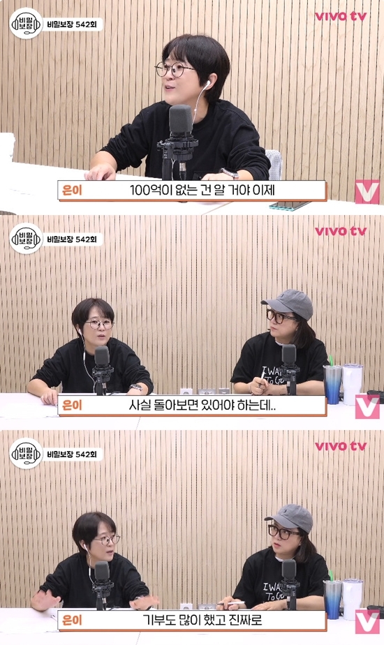 송은이는 “이제는 사람들이 내가 100억이 없다는 걸 다 안다. 돌아보면 있어야 하는데 많이 썼다”며 “내가 필요한 만큼은 모으고 있다고 생각한다. 나머지는 이고 지고 갈 것도 아니니까 기부도 많이 했다”고 덤덤히 말했다.