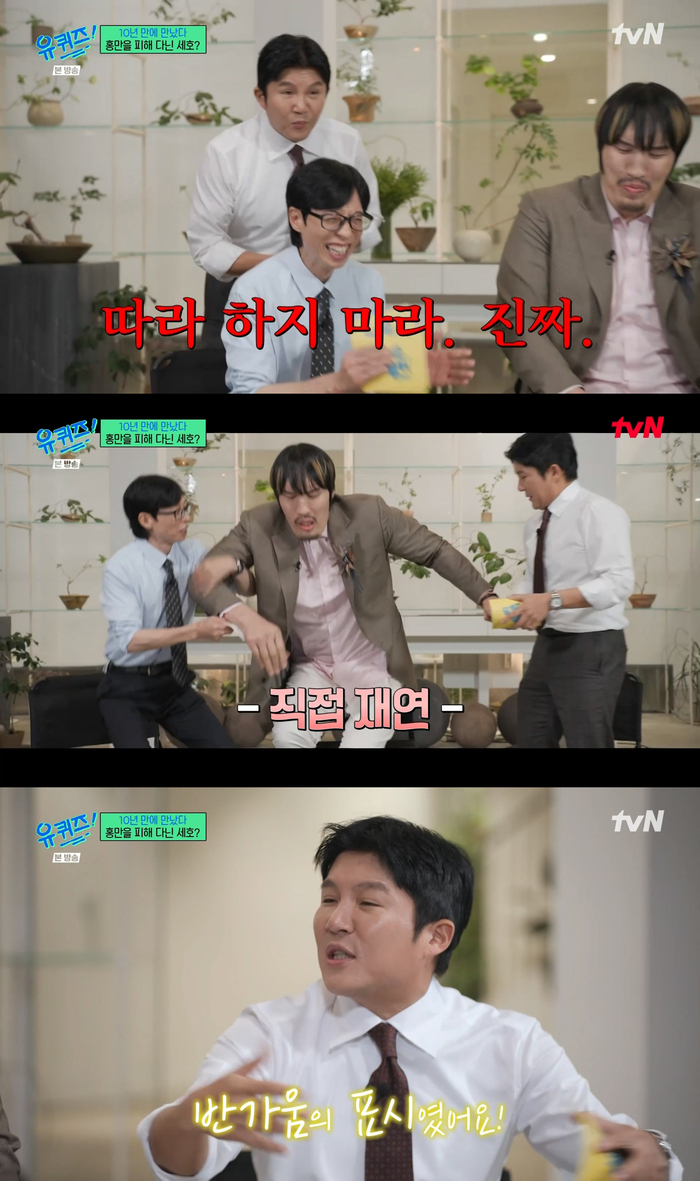 이에 얘기를 들은 최홍만은 자리에서 일어나 조세호와 함께 당시 장면을 재현했다. 조세호 뒤에서 목덜미를 잡은 거구 최홍만은 “따라하지 마라! 또 따라하면...”이라며 위압적인 모습을 장난스레 연출했다. 이 상황에 대해 조세호는 “홍만 형의 반가움의 표시였다”며 설명을 덧붙였다.
