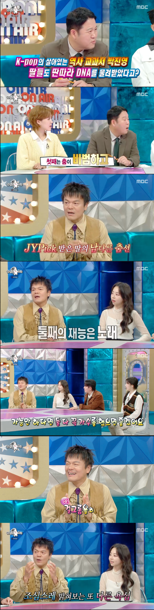 박진영은 전날인 5일 방송된 MBC ‘라디오스타’에 출연해 박진영은 “(두 딸에게) 가수 DNA가 있다”며 “(첫째 딸은) 춤이 비범”하다면서 “(둘째 딸은) 노래에 재능이 있다”고 밝혔다. 그는 “가능하다면 둘 다 가수를 꼭 했으면 좋겠다”라고 바랐다.