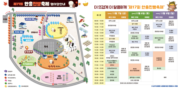 이 외에도 향토 먹거리 장터, 지역 농특산물 판매, 수공예품 판매점 등이 운영되며 아이들과 함께 할 수 있는 찐빵 관련 소품 만들기, 전통 놀이체험 존, 캠핑 컨셉의 힐링존, 플라워 포토존, 야외 놀이터 등 다양한 볼거리와 놀거리로 축제장을 가득 채울 예정이다.