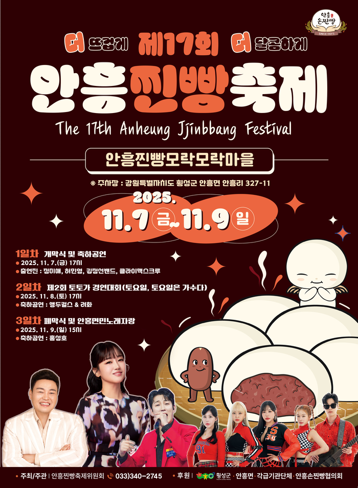 [스포츠서울ㅣ김기원기자]‘제17회 안흥찐빵축제’가 오는 7일부터 9일까지 3일간 횡성군 안흥면 안흥찐빵 모락모락마을 일원에서 개최된다.