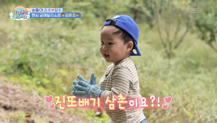 정우는 아빠의 한마디에 밤 줍기에 돌입, 발끝에 힘을 모아 밤송이를 풀파워로 차며 밤 줍기를 시작했다. 열심히 밤을 수확한 정우는 “진또배기 삼촌” 이라며 이찬원에 대한 애정을 드러냈다.