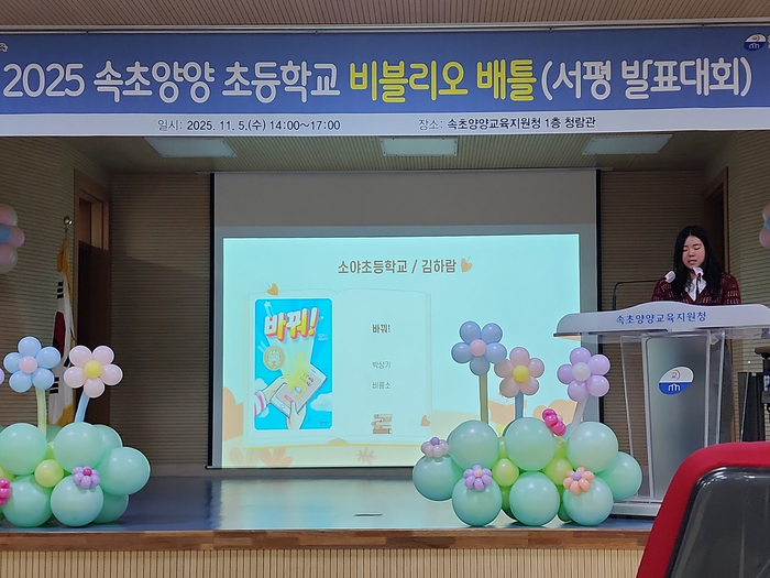 [스포츠서울ㅣ춘천=김기원기자]강원특별자치도 속초양양교육지원청(교육장 한명진)은 △11월 4일(화) 강원특별자치도교육청 국제교육원 △11월 5일(수) 속초양양교육지원청 청람관에서 ‘2025 속초양양 초등학교 비블리오 배틀’ 대회를 개최했다.