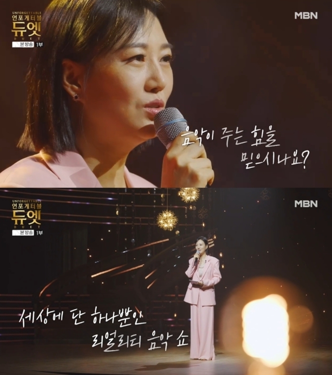 장윤정은 지난 5일 첫 방송된 MBN ‘언포게터블 듀엣’에서 “세상에 단 하나밖에 없는 리얼리티 음악쇼. 기억을 부르는 기적의 무대 ‘언포게터블 듀엣’의 장윤정입니다”라고 소개하며 새로운 토크쇼의 시작을 알렸다.