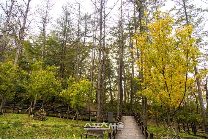 유아숲 체험원을 지나면 본격적인 숲길이다. 완만한 나무 데크길 양옆에는 울창한 나무가 줄지어 서 있다. 북쪽 지역이라 그런지 가을빛이 더 빠르고 짙게 물든다. 좌우로 굽은 오르막 데크길은 1km 지점쯤에서 내리막으로 바뀌고, 700여 미터 정도 아기자기한 데크길이 더 이어진다. 걷다 보면 종종 나무에 묶어둔 ‘잘될 거야’ 혹은 ‘잘하고 있어’와 같은 문구들이 눈에 들어온다. 숲을 걷는 동안 작은 위로가 되어주는 말들이다. 그렇게 숲길을 한 바퀴 돌고 나면 마음이 한결 따뜻해지고, 다시 일상으로 돌아갈 힘이 생긴다.