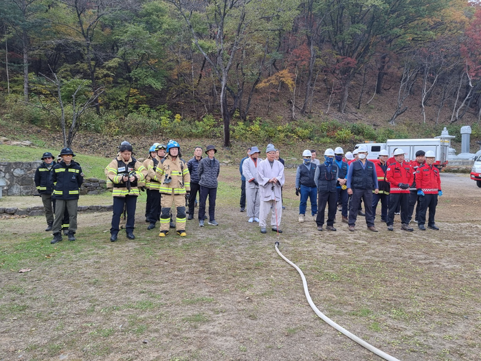 [스포츠서울ㅣ김기원기자]속초시는 11월 6일 오후 2시, 보물로 지정된 신흥사 극락보전에서 2025년 하반기 국가유산 화재대응훈련을 실시했다. 훈련에는 속초소방서, 강원문화유산돌봄센터, 국립공원공단 설악산사무소 등 관계기관이 참여해 대피 유도, 상황 전파, 구조 및 화재 진압 등 전 과정을 실전처럼 이뤄졌다.