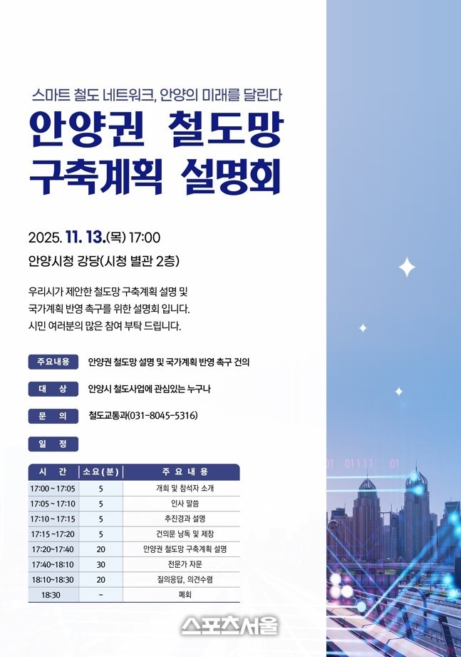 〔스포츠서울│안양=좌승훈기자〕경기 안양시가 오는 13일 17시 시청 강당에서 ‘안양권 철도망 구축계획 설명회’를 갖는다.