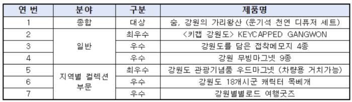 강원관광재단 최성현 대표이사는 “공모전에 참여해주신 모든 분들에게 감사드리며 앞으로도 강원특별자치도만의 특별한 굿즈를 발굴하여 지역관광 활성화에 기여하겠다”고 전했다.