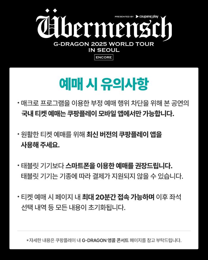쿠팡플레이는 티켓 오픈을 앞두고 팬들을 위한 ‘성공 예매 가이드’를 전격 공개했다. 티켓 판매는 11월 10일(월) 오후 8시 팬클럽 선예매, 11일(화) 오후 8시 일반 예매로 진행된다.팬클럽 선예매는 ‘G-DRAGON OFFICIAL MEMBERSHIP’ 가입 와우회원만 참여 가능하며, 쿠팡플레이 앱을 통해 멤버십 번호를 등록·인증해야 한다.