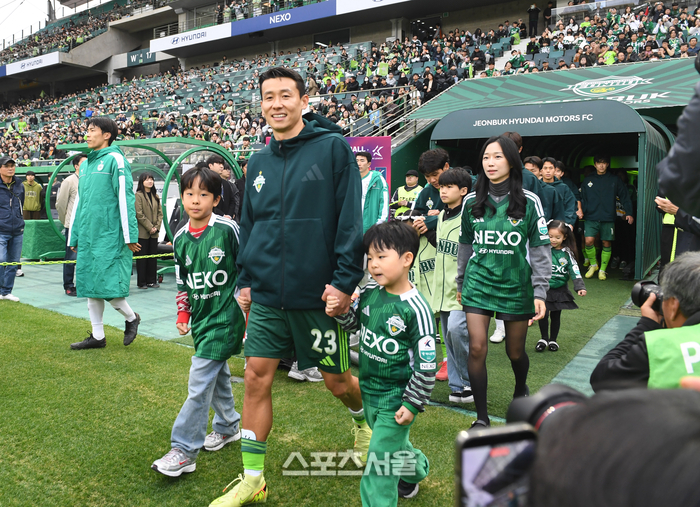 전북 현대 김태환이 8일 전주월드컵경기장에서 열린 하나은행 K리그1 대전 하나 시티즌과 경기에 앞서 가족과 함께 그라운드로 입장하고 있다. 2025. 11. 8.