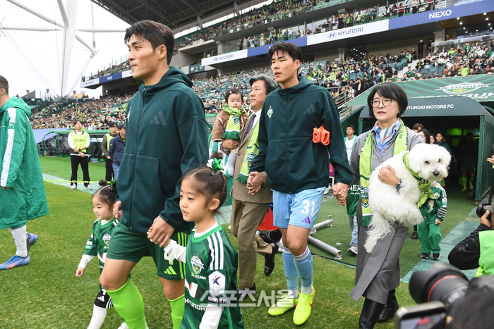 전북 박진섭(왼쪽)과 송범근이 8일 전주월드컵경기장에서 열린 하나은행 K리그1 대전 하나 시티즌과 경기에 앞서 가족과 함께 그라운드로 입장하고 있다. 2025. 11. 8.