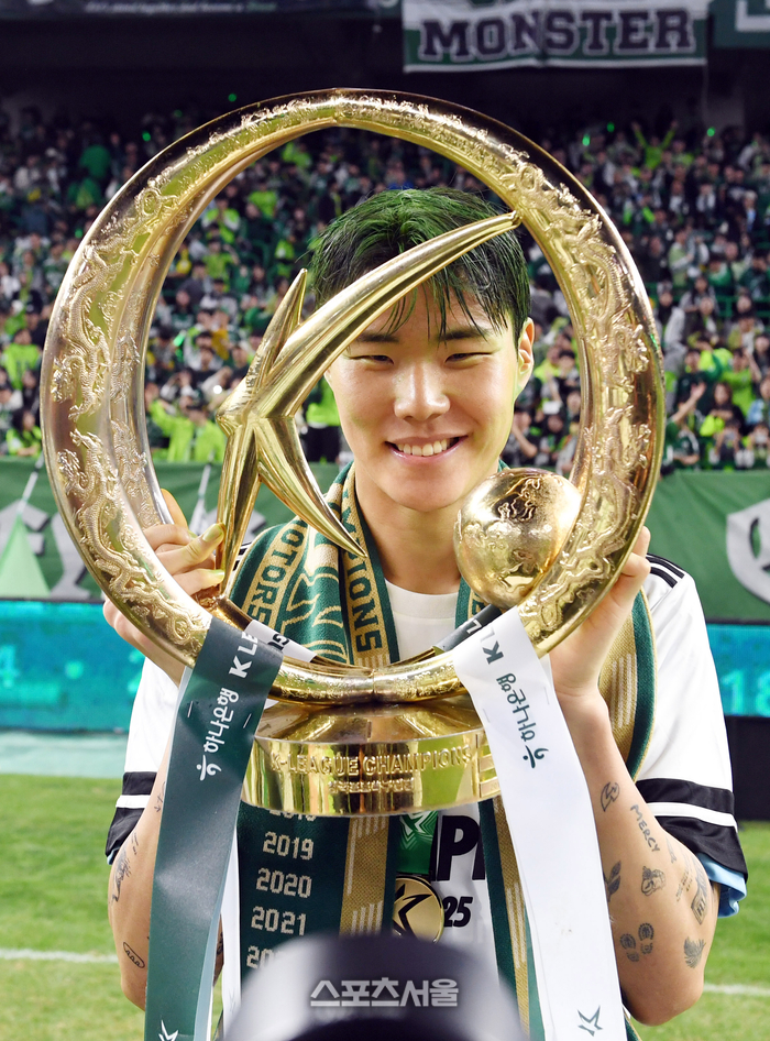 전북 현대의 골키퍼 송범근가 8일 전주월드컵경기장에서 열린 하나은행 K리그1 대전 하나 시티즌과 경기 후 진행된 우승 기념 행사에서 팬들 앞에서 트로피를 들고 기념촬영을 하고 있다. 2025. 11. 8.