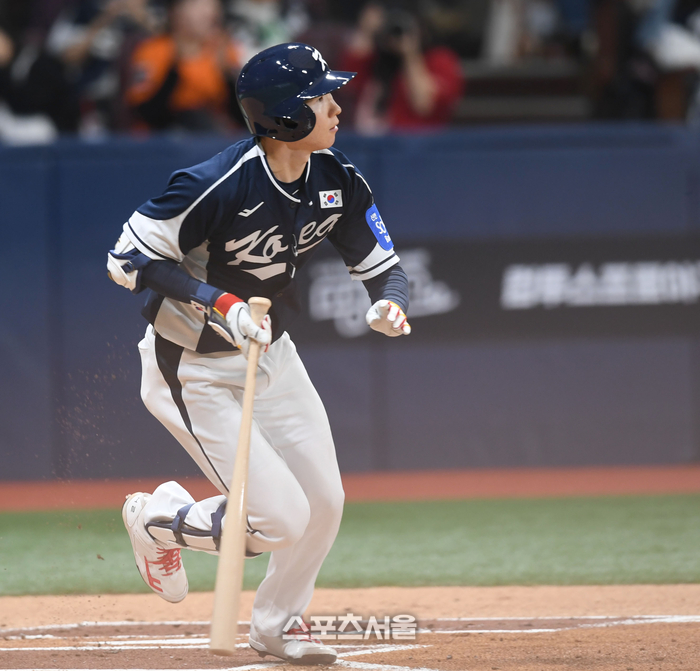 박성한이 9일 서울 고척 스카이돔에서 열린 ‘2025 K-베이스볼 시리즈’ 체코와 2차전 경기 2회초 2사 좌중간 안타를 치고 있다.