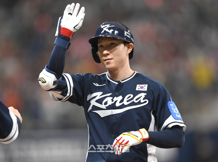 박성한이 9일 서울 고척 스카이돔에서 열린 ‘2025 K-베이스볼 시리즈’ 체코와 2차전 경기 2회초 2사 좌중간 안타를 친 후 세리머니를 하고 있다.