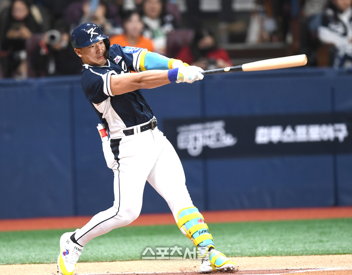 안현민이 9일 서울 고척 스카이돔에서 열린 ‘2025 K-베이스볼 시리즈’ 체코와 2차전 경기 1회초 무사1루 타격하고 있다. 1루수 파울플라이 아웃.