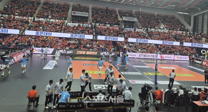 OK저축은행은 9일 부산 강서체육공원 체육관에서 열린 진에어 2025~2026 V리그 남자부 대한항공과 맞대결을 통해 새 연고지 부산에서 첫 경기를 치르고 있다.
