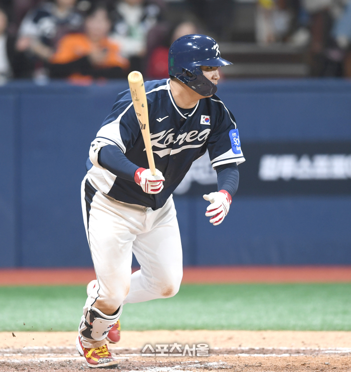 문보경이 9일 서울 고척 스카이돔에서 열린 ‘2025 K-베이스볼 시리즈’ 체코와 2차전 경기 8회초 1사 내야땅볼을 치고 있다.