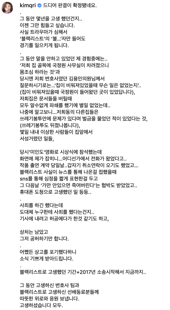 “드디어 판결이 확정됐다. 이젠 그만 힘들고 싶습니다”라고 운을 뗀 그녀는 “사실 트라우마가 심해서 블랙리스트의 ‘블’자만 들어도 경기를 일으키게 됩니다”라며 지난 시간 겪었던 고통의 깊이를 짐작하게 했다.