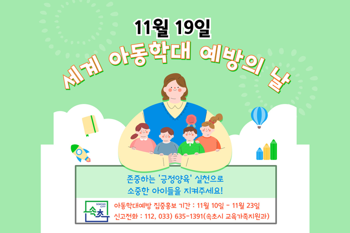 [스포츠서울ㅣ김기원기자]속초시는 11월 19일 ‘세계 아동학대 예방의 날’을 맞아 아동권리 존중 인식을 확산하고 지역사회 내 아동학대 예방 분위기를 조성하기 위해 11월 10일부터 23일까지 아동학대 예방 집중홍보 기간을 운영한다.