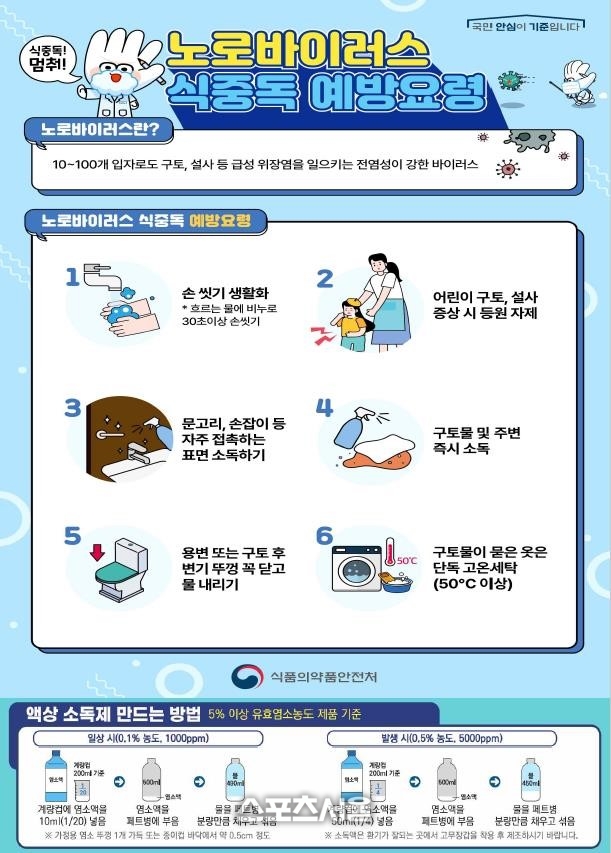 정연표 식품안전과장은 “노로바이러스는 전염성이 매우 강한 만큼 손 씻기와 음식물의 충분한 가열 등 기본 수칙만 실천해도 예방 효과가 높다”며 “특히 보육시설과 집단급식소는 조리 종사자 위생관리와 환경 소독에 적극 협조해달라”고 말했다.