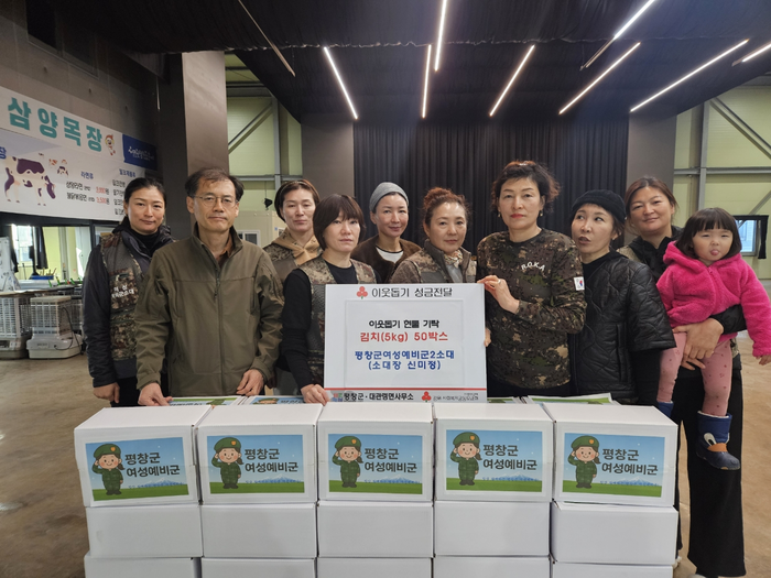 [스포츠서울ㅣ김기원기자]평창군여성예비군 2소대(소대장 신미정)는 9일 대원들이 직접 담근 김장 김치(5kg) 20박스를 대관령면사무소에 기탁했다.