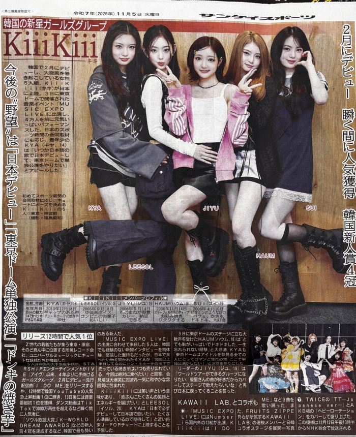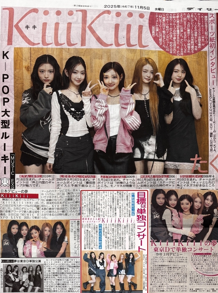 매체는 지난 3일 키키가 일본 도쿄돔에서 열린 NHK에서 12월 12일 방송이 결정된 이벤트 ‘뮤직 엑스포 라이브 2025(MUSIC EXPO LIVE 2025)’ 무대에 오른 것에 주목했다. 키키 멤버들은 “모든 아티스트의 꿈인 도쿄돔에서 라이브를 할 수 있었다는 것이 너무 영광이고 꿈만 같다”고 전했고, “언젠가 일본 데뷔를 해 도쿄돔에서 단독 공연을 열고 싶고, 월드 투어도 돌면서 티키(공식 팬클럽명)들에게 많은 웃음을 전하고 싶어요”라고 포부를 밝혔다.