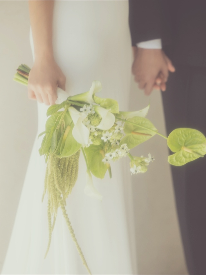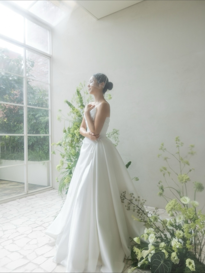 특히 얼굴을 살짝 가린 비즈 장식의 베일과 면사포를 활용한 클로즈업 사진은 고혹적이면서도 몽환적인 분위기를 자아낸다. 예비 신랑으로 보이는 인물과 손을 맞잡고 있는 사진은 설렘 가득한 예비 부부의 모습을 보여준다.
