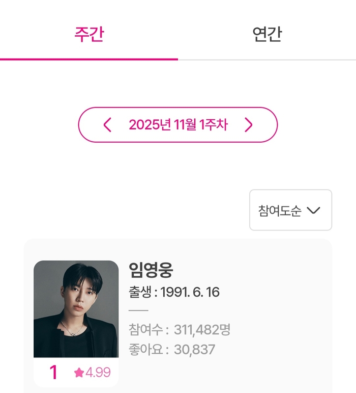지난 10일 아이돌차트에 따르면 임영웅은 지난 3일부터 9일까지 집계된 11월 1주차 평점랭킹에서 득표수 31만 1482표를 기록. 1위를 차지했다. 이를 통해 임영웅은 아이돌차트 평점랭킹에서 241주 연속 1위에 오르는 기염을 토했다.