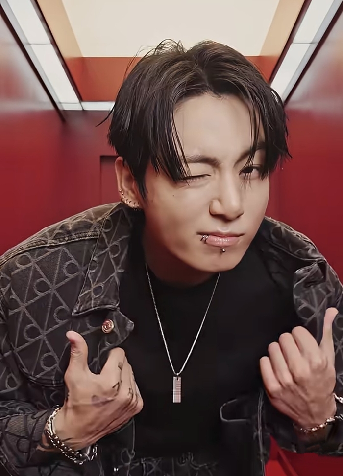 화면 속 정국은 가죽 재킷을 중심으로 한 올블랙 스타일링으로 등장, 시크하면서도 강렬한 섹시 무드로 시선을 압도한다.