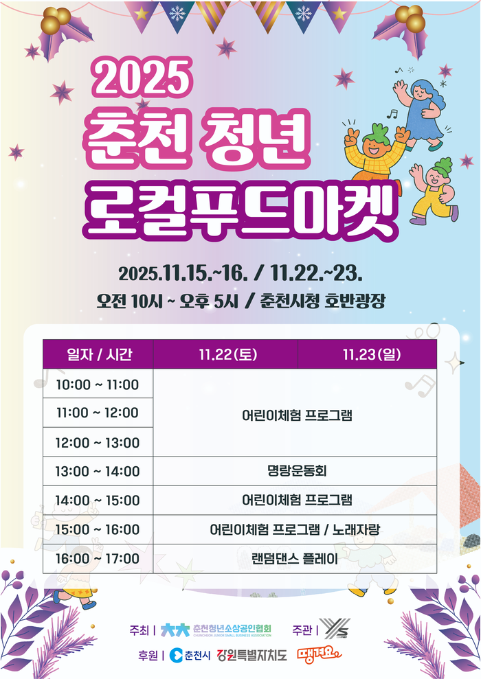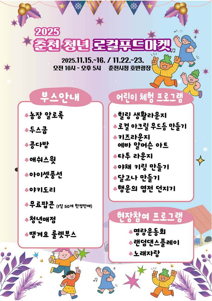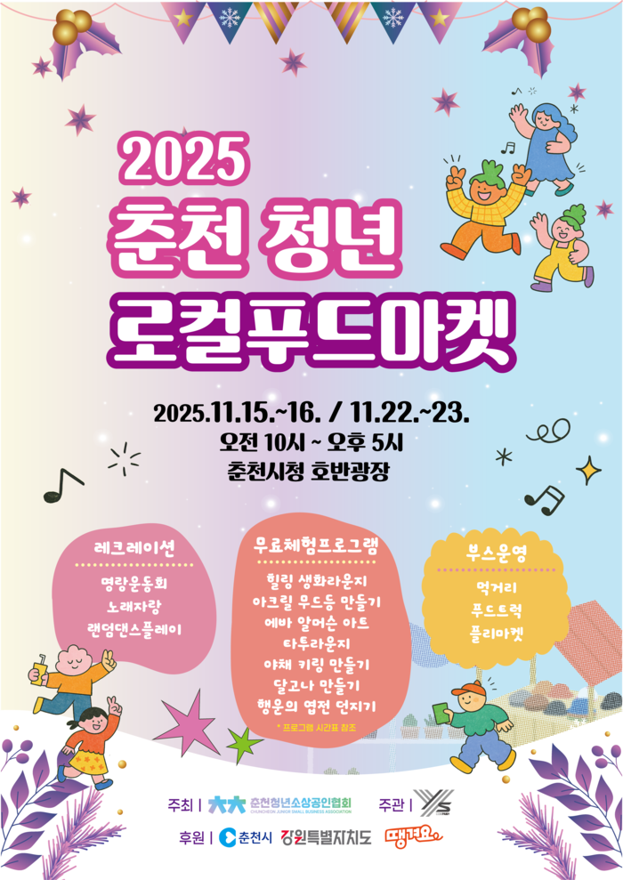 춘천시(시장 육동한)가 오는 15~16일, 22~23일 이틀씩 2주간 ‘2025 춘천 소상공인 상생 직거래장터’를 연다.