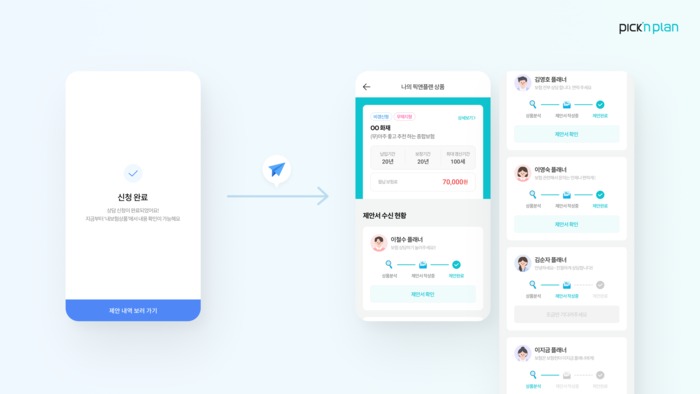 ‘픽앤플랜’의 ‘크라우드 컨설팅’은 고객이 온라인 및 모바일 환경에서 3명에서 최대 5명의 전문 보험 설계사로부터 각각의 맞춤 제안을 받아볼 수 있도록 설계된 기능이다.