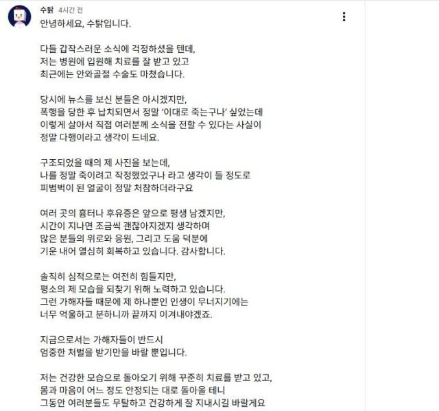 유튜버 수탉은 11일 자신의 채널에에 “다들 갑작스러운 소식에 걱정하셨을 텐데, 저는 병원에 입원해 치료를 잘 받고 있고 최근에는 안와골절 수술도 마쳤다”는 내용의 근황 글을 게시했다.