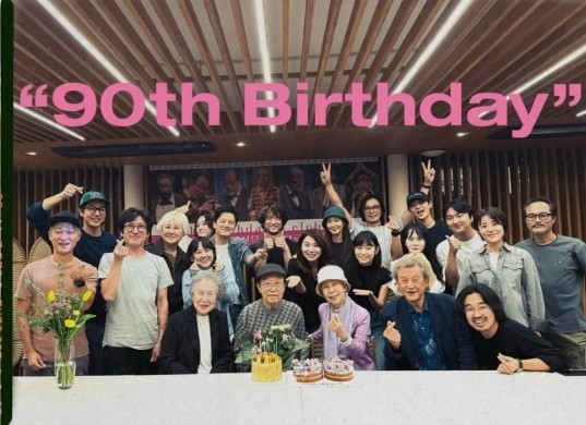 사진 속에는 “90th Birthday”의 문구 아래 많은 이들이 카메라를 향해 포즈를 취하고 있다. 아래쪽 중앙에는 신구가 손숙, 박근형 등과 함께 앉아 있다.
