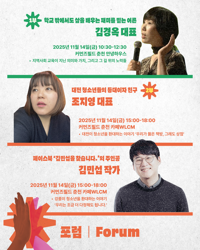 첫째 날인 14일(금) 오전에는 춘천형 마을교육돌봄공동체 ‘우리봄내동동 포럼’을 시작으로 청소년을 환대하는 ‘맡겨놓은 카페 포럼’과 ‘청소년+시민 공론장’이 운영된다.
