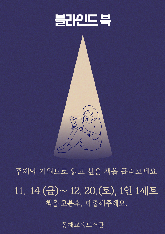 [스포츠서울ㅣ김기원기자]강원특별자치도 동해교육도서관(관장 안은희)은 11월 14일(금)부터 12월 20일(토)까지 각 자료실에서 ‘블라인드 북 특별대출’ 행사를 운영한다. 이번 행사는 도서의 제목과 표지를 가린 채, 도서별 키워드만을 단서로 책을 선택하는 이색 독서 프로그램으로, 시민들의 독서에 대한 흥미와 호기심을 자극하기 위해 마련됐다.